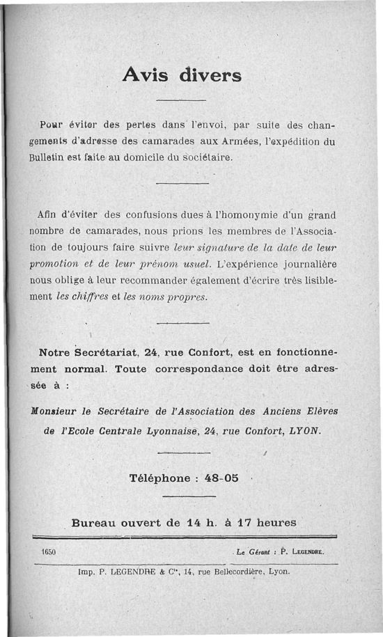 Association des Anciens Eleves de l'Ecole Centrale Lyonnaise, Décembre 1918, 46 pages