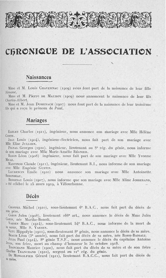 Association des Anciens Eleves de l'Ecole Centrale Lyonnaise, Mars 1919, 48 pages