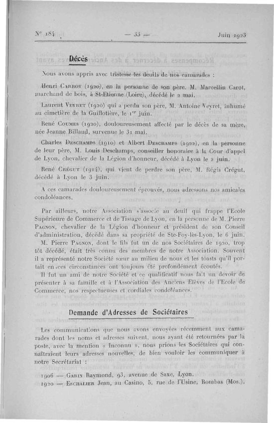Association des Anciens Elèves de l'Ecole Centrale Lyonnaise, Juin 1923, 56 pages