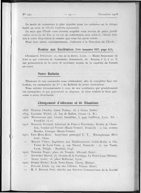 Association des Anciens Eleves de l'Ecole Centrale Lyonnaise, Décembre 1928, 48 pages