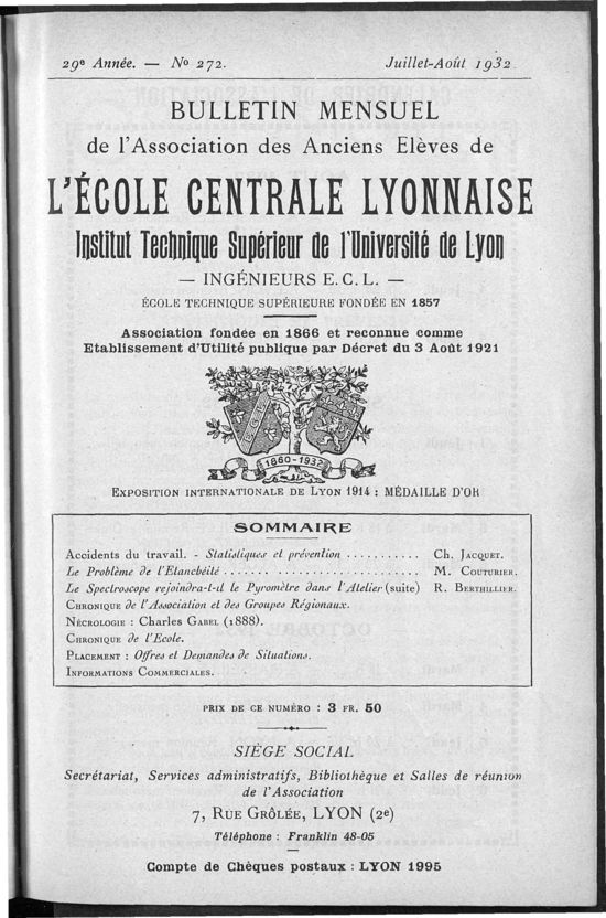 Association des Anciens Elèves de l'Ecole Centrale Lyonnaise, Juillet-Août 1932, 56 pages